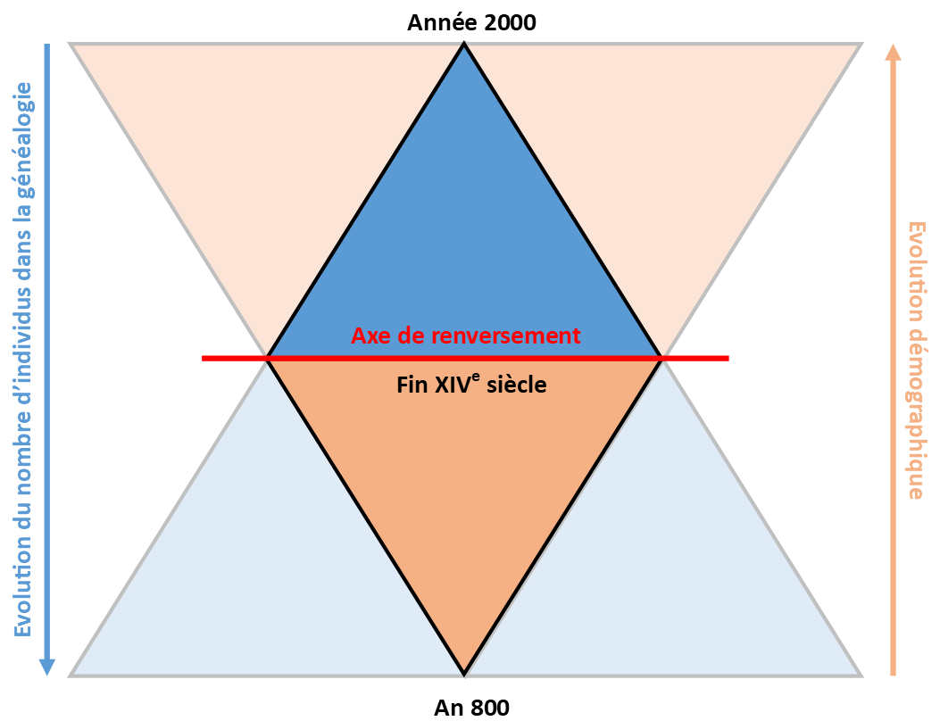 Au fil du temps, la population mondiale, a connu une croissance considérable depuis le début de l’ère chrétienne. Les historiens estiment qu’elle était d’environ 300 millions de personnes il y a 2000 ans et atteint aujourd’hui les 8 milliards d’individus. Les individus vivants à l’époque du Christ ont à travers les âges, engendré une nombreuse descendance, dont nous faisons partie, tandis que nous n’avons qu’un nombre limité d’aïeux réels qui remontent à cette époque. Cette rupture entre le nombre théorique de nos ancêtres et la population vivante à une époque et un territoire donné, est ce qu’on appelle « l’axe de renversement ».