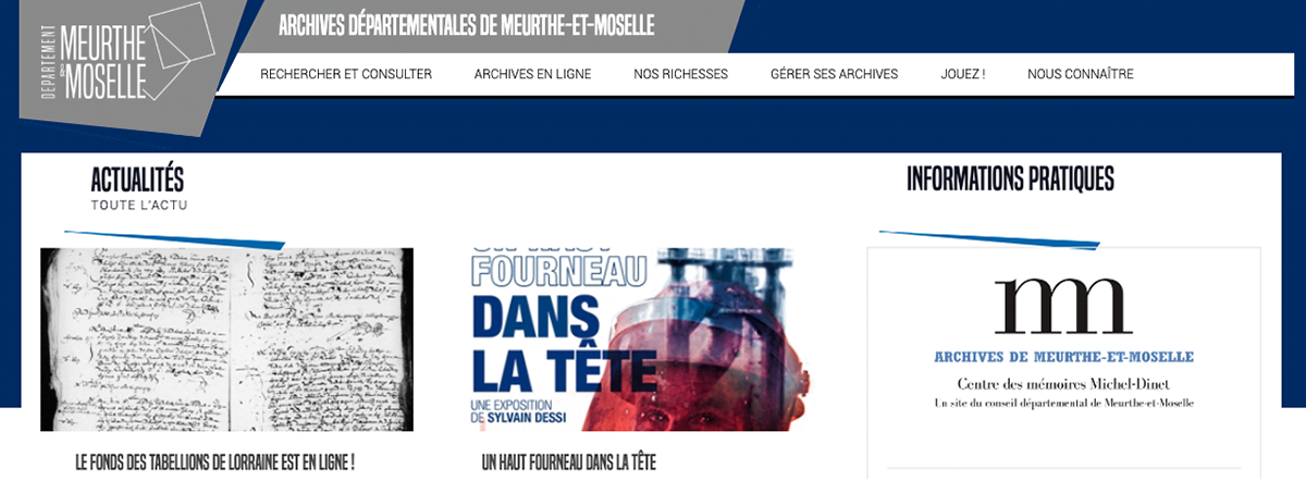 Les archives de Meurthe-et-Moselle publient le fonds des tabellions de Lorraine, autrement dit les notaires. Plus de 1,7 million de vues sont en ligne, couvrant une large période allant de 1434 à 1810 pour près de 750 tabellions différents. La numérisation a été faite à partir de microfilms.
