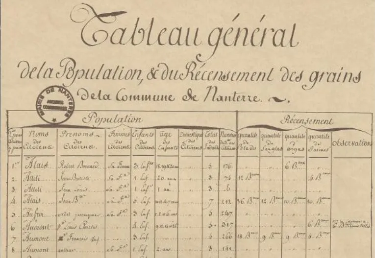 - Tableau général population et du recensement des grains de la commune de Nanterre (extrait) - Société d’Histoire de Nanterre