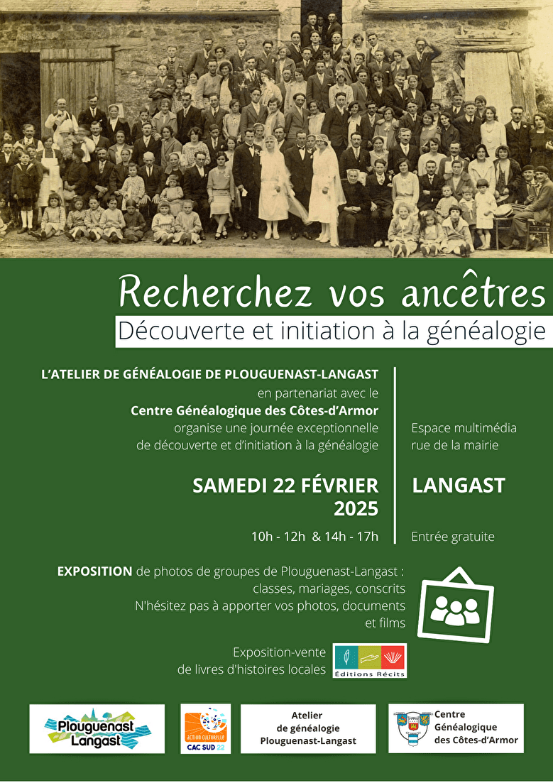L’atelier de généalogie de Plouguenast-Langast, en collaboration avec le Centre Généalogique des Côtes-d’Armor organise une journée exceptionnelle de découverte et d’initiation à la généalogie le samedi 22 février 2025.