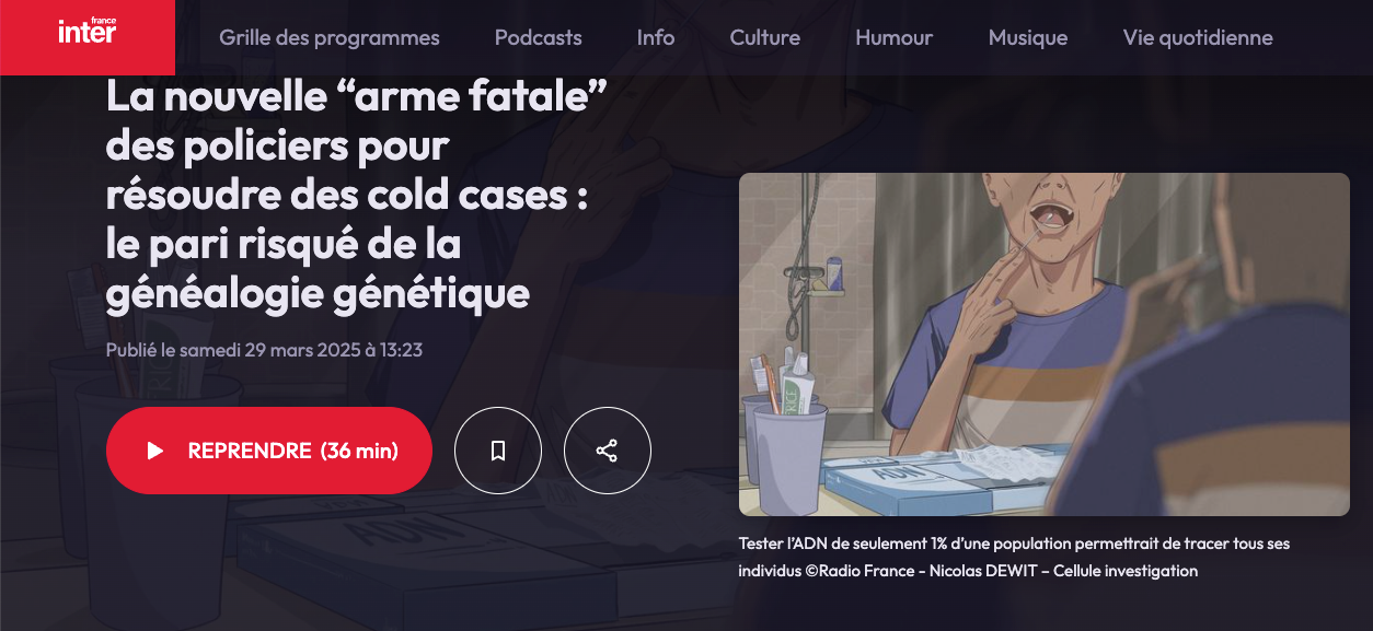 L’affaire du “prédateur des bois”, élucidée grâce à un test ADN réalisé par un cousin éloigné, marque l’entrée discrète mais spectaculaire de la généalogie génétique dans les enquêtes criminelles françaises. France Inter avec Secrets d’info a enquêté sur cette technique encore interdite en France.